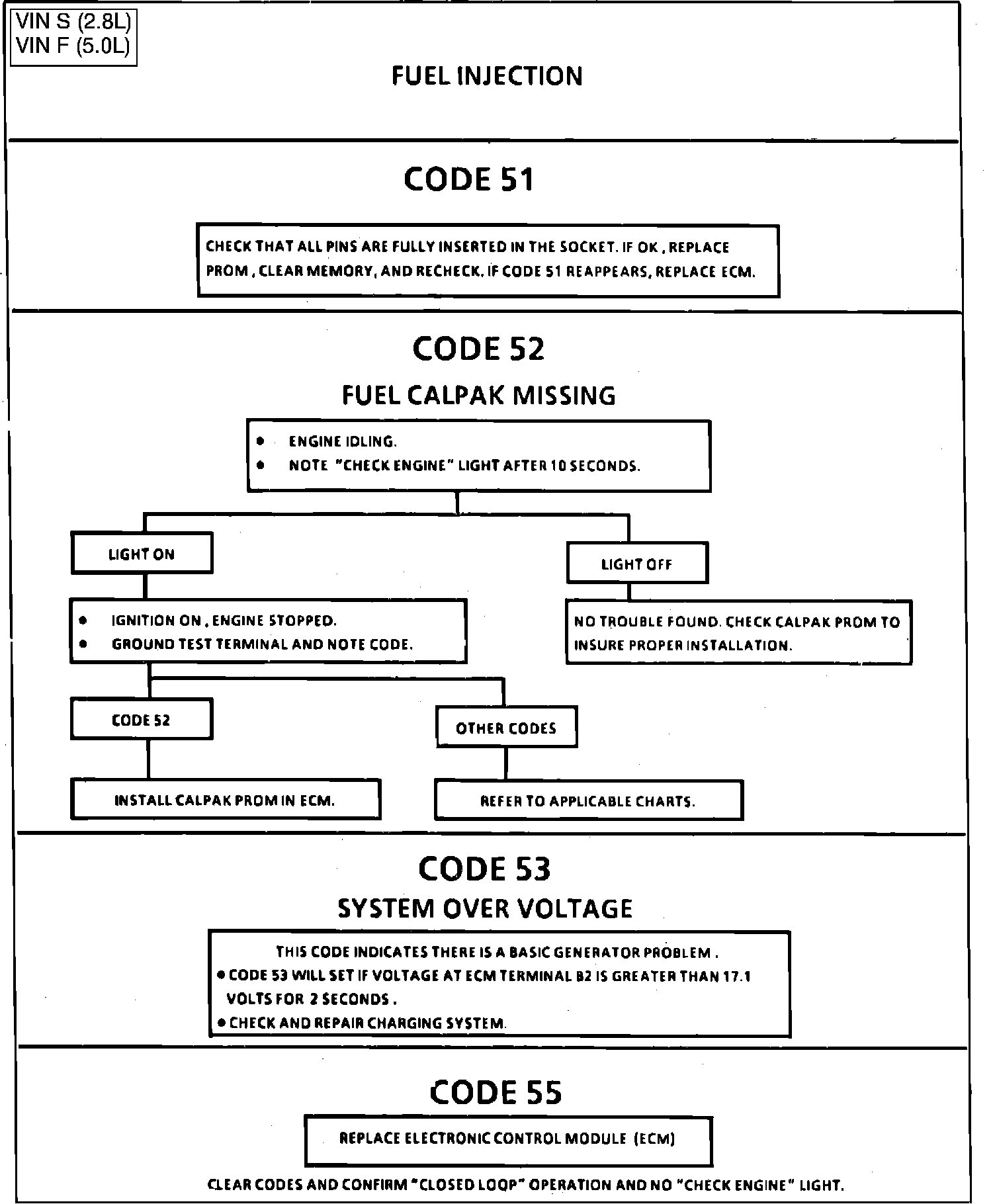 Code 51 Prom, Code 52 Calpak, Code 53 System Over Voltage and Code 55 ECM:
