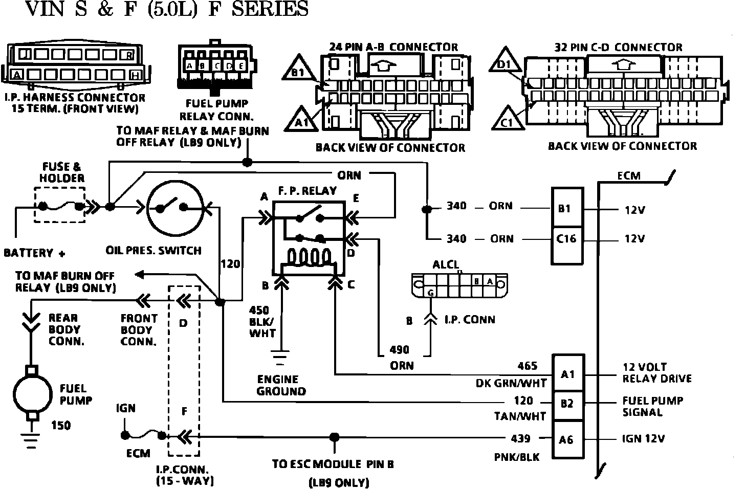 The status of the fuel pump circuit 120 is monitored by the ECM at terminal B2 and is used to compensate fuel delivery based on system voltage. This signal is also used to store a trouble code if the fuel pump relay is defective or fuel pump voltage is lost while the engine is running. There should be about 12 volts on CKT 120 for 2 seconds after the ignition is turned or any time references pulses are being received by the ECM.