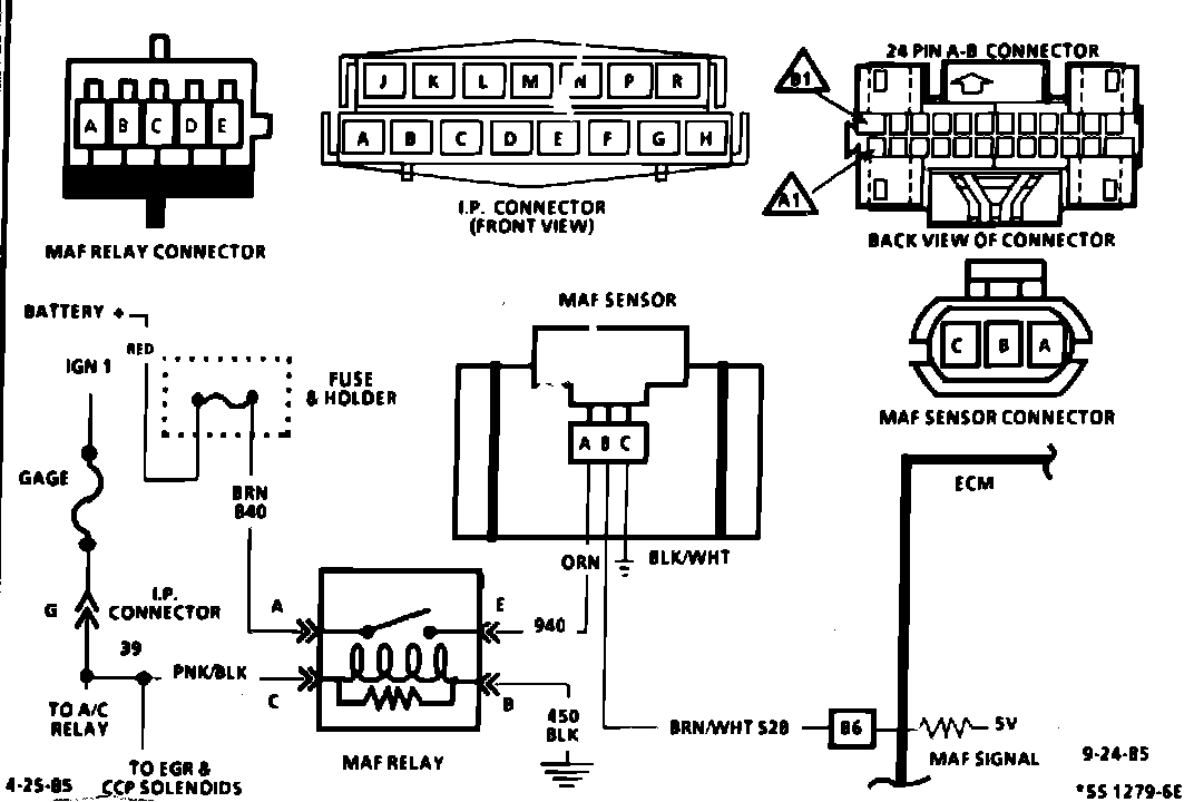 The terminal identification of the Mass Air Flow relay, in the 1985 Camaro Shop Manual (ST-368-85), was printed in error. The following diagram shows the correct terminal identification. Please note this change in your copy of ST-368-85 on Page 6E3-44.