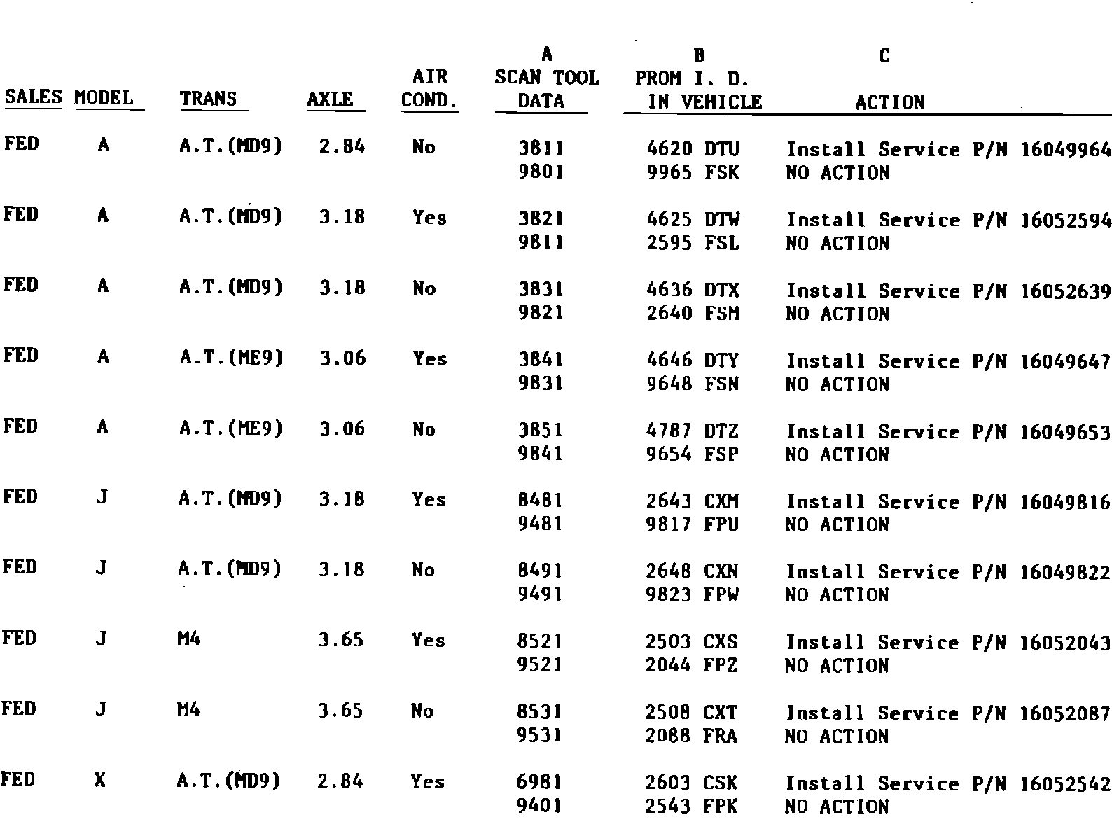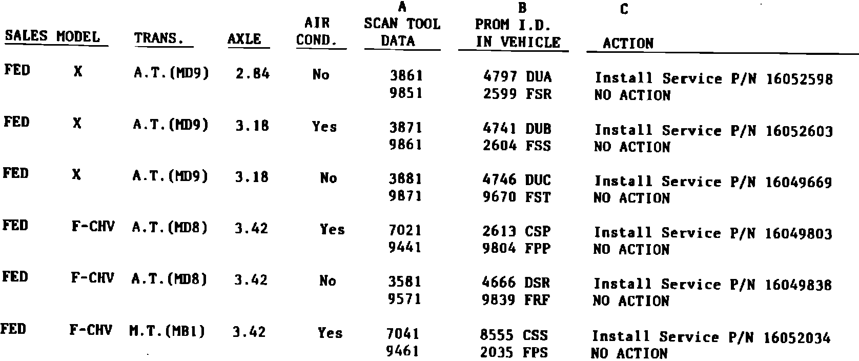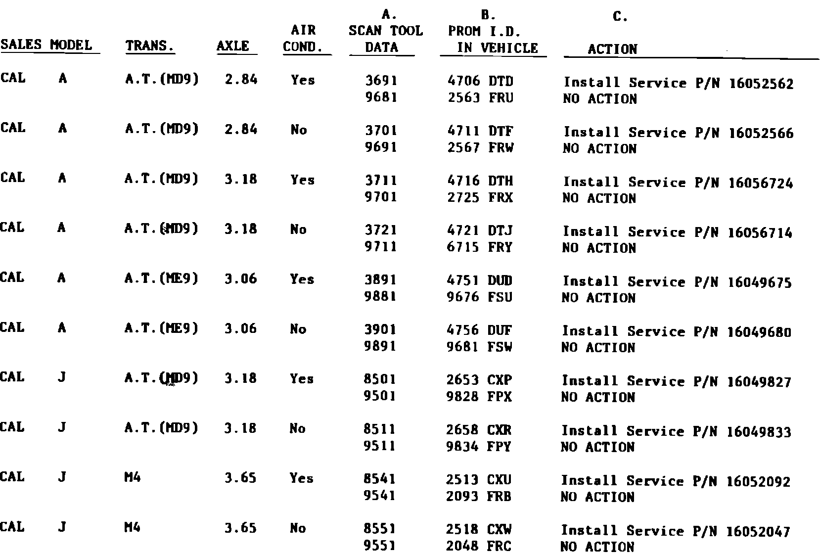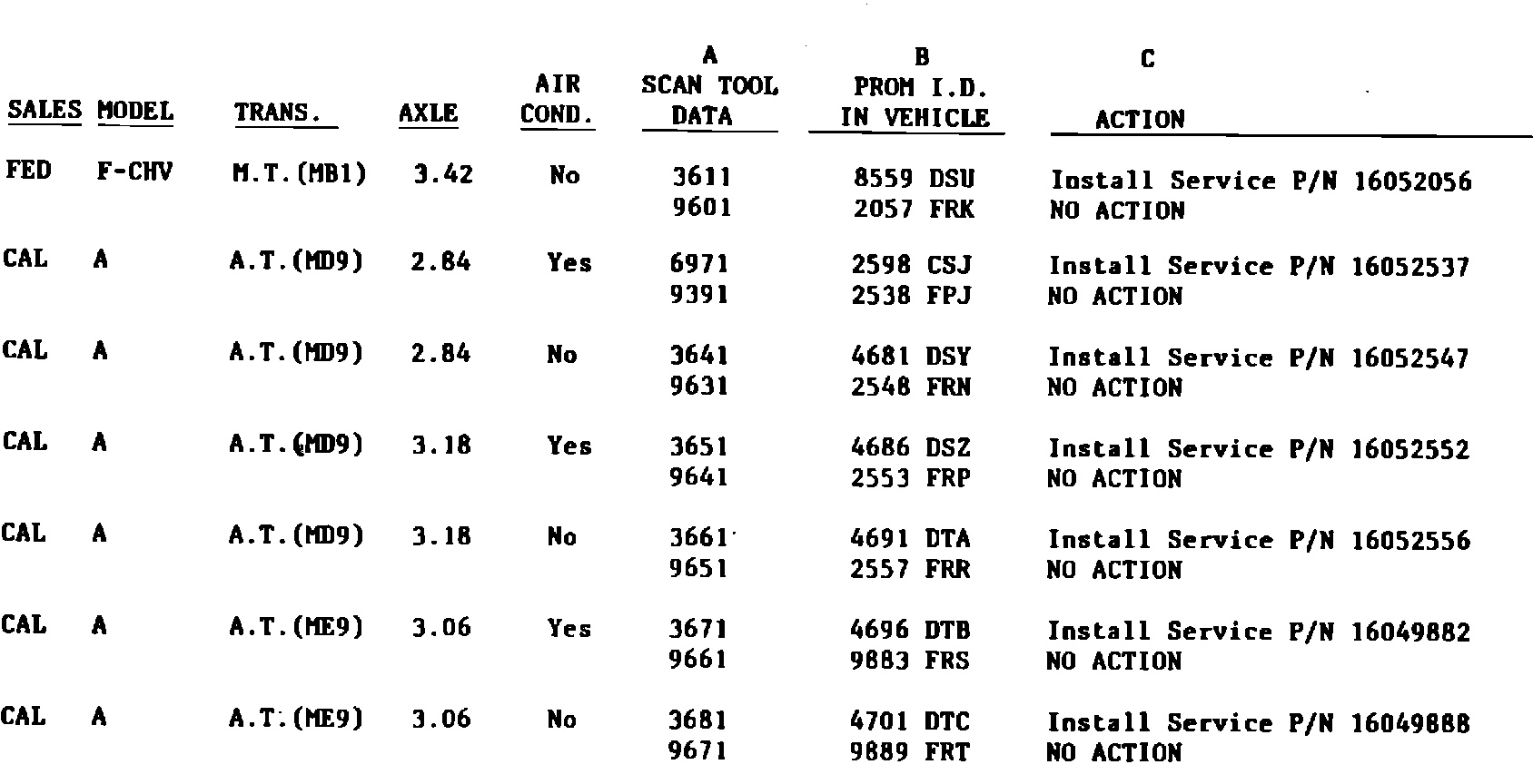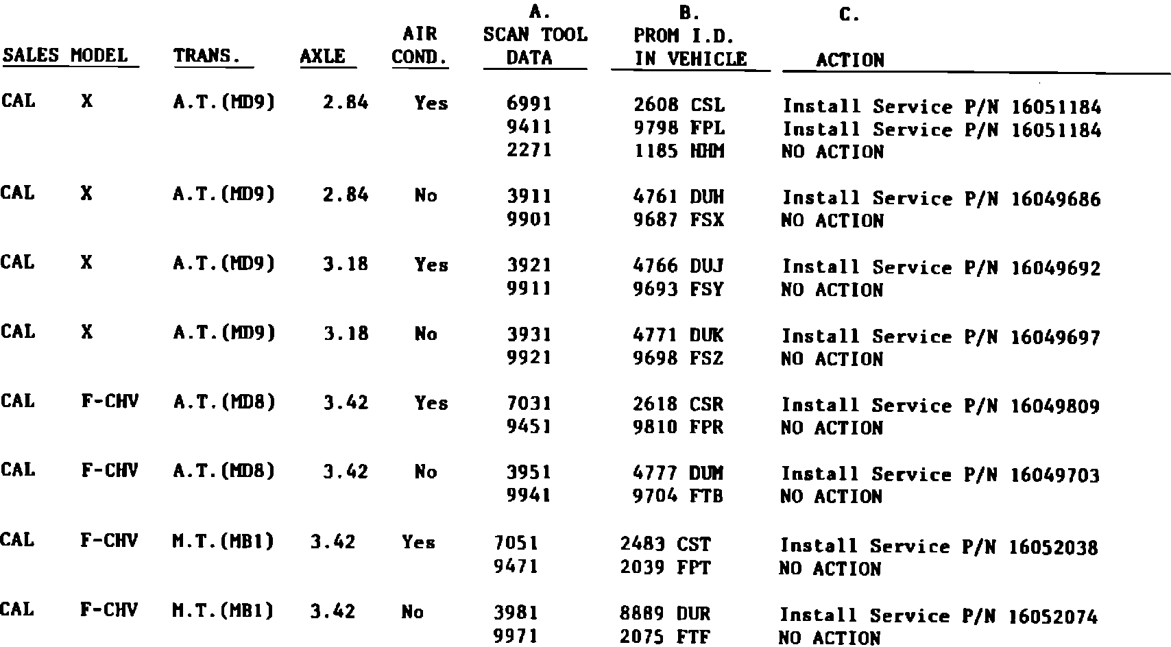 If scan tool is available, determine PROM I.D. using a scan tool, find scan data in Column A of the chart and perform action in column C.