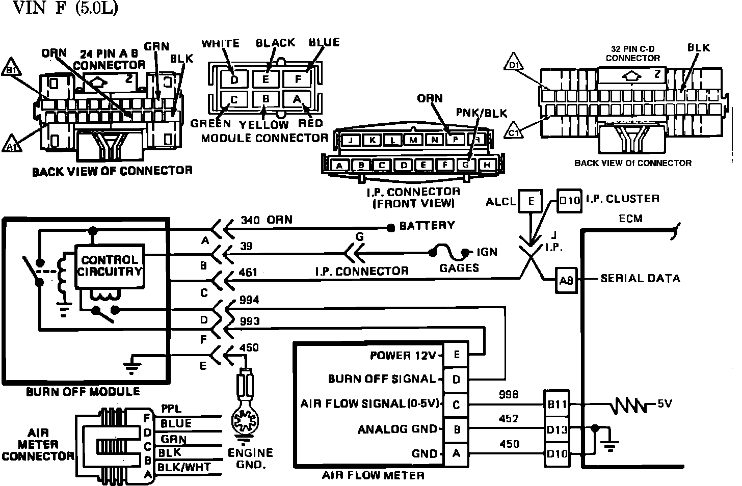 Due to contaminates in the atmosphere a residue may build up on the air flow meters sensing wire. To maintain an accurate reading from the meter a "burn-off" cycle will only occur if the ignition is turned off while in the closed loop mode and this is determined by the sate of the serial data line (CKT 461). If the engine is shut down while in open loop or the ignition is cycled on to off, the serial data line will be in a high state (about 5 volts) and remain there for about 5 seconds. However, if the ignition is turned off while in closed loop the serial data line will go to about 2.5 volts for 5 seconds. This voltage (2.5 volts or less) is what triggers the control circuitry in the burn off module and causes burn-off to occur. When the conditions are met to activate burn-off, a 3 to 5 second delay will couur. After this delay the control circuitry will cause 12 volts to be applied on CKT 994 for 1 second and this will cause the meters sensing wire to glow red hot (about 1000°F) and the cycle is then complete.