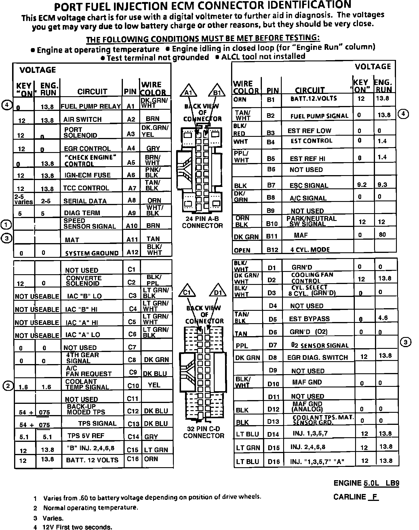 Fig. 022 ECM Connector Terminal Identification & Voltage Specifications: