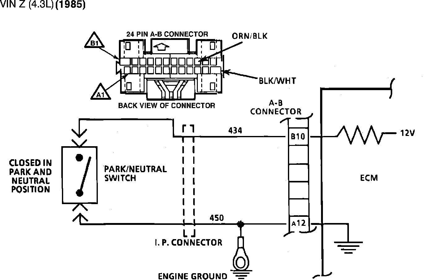 The Park/Neutral Switch is closed to ground in Park or Neutral and open in Drive ranges. The ECM supplies 12 volts through an internal resistor to CKT 434 and senses that the switch is closed when the voltage at terminal B10 drops to less than 1 volt.