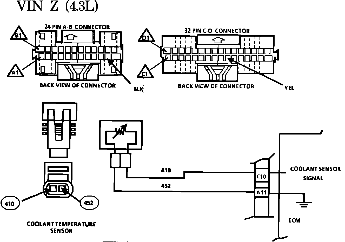 As the engine warms, the sensor resistance becomes less, and the voltage drops. At normal engine operating temperature the voltage will measure about 1 to 1.5 volts at the ECM terminal C10.