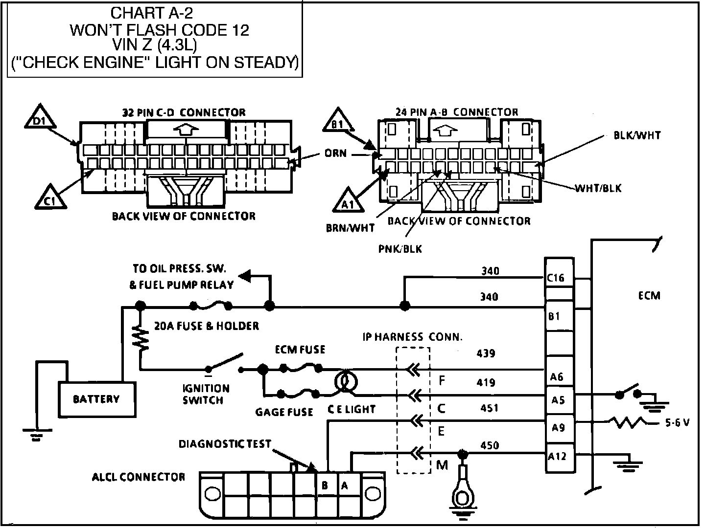 CHART A-2, WON'T FLASH CODE 12 ("CHECK ENGINE" LIGHT ON STEADY)