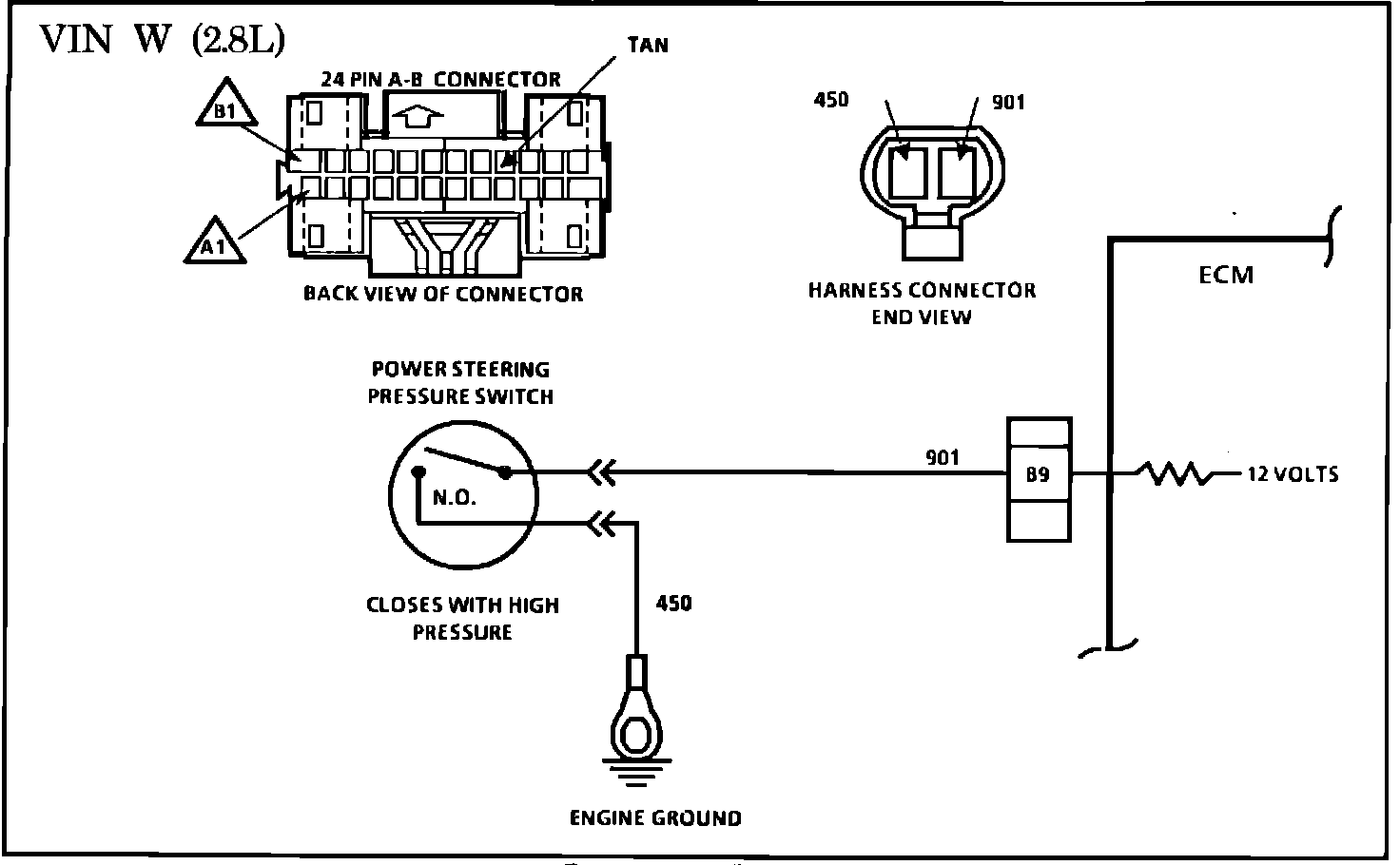 1. Checks for ECM signal voltage on CKT 901, and confirms that ground CKT 450 is OK. Optional test for A/C equipped vehicles: With clutch on, turn the steering wheel against stop. If P/S pressure switch is functioning properly the clutch should disengage.