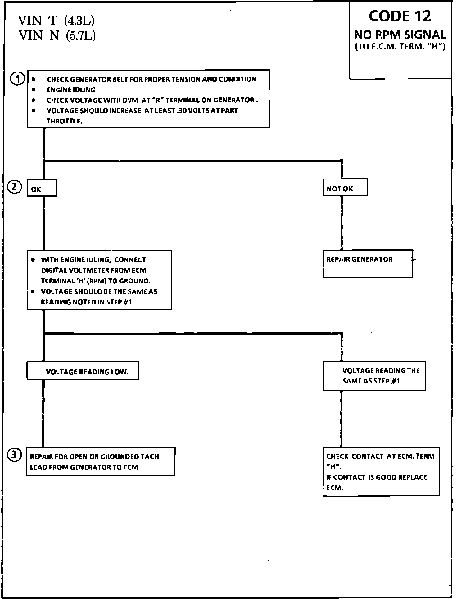 Code 12 means the ECM is "ON" and sees no RPM signal from generator. This is a normal code with the ignition "ON" and engine not running. Code 12 is not stored and will only flash when the fault is present. With the engine running, Code 12 could mean either an open or ground in the tach signal circuit. Code 41 will appear if the engine is running with no RPM signal and vehicle is moving. Code 41 will store, even if the problem clears.