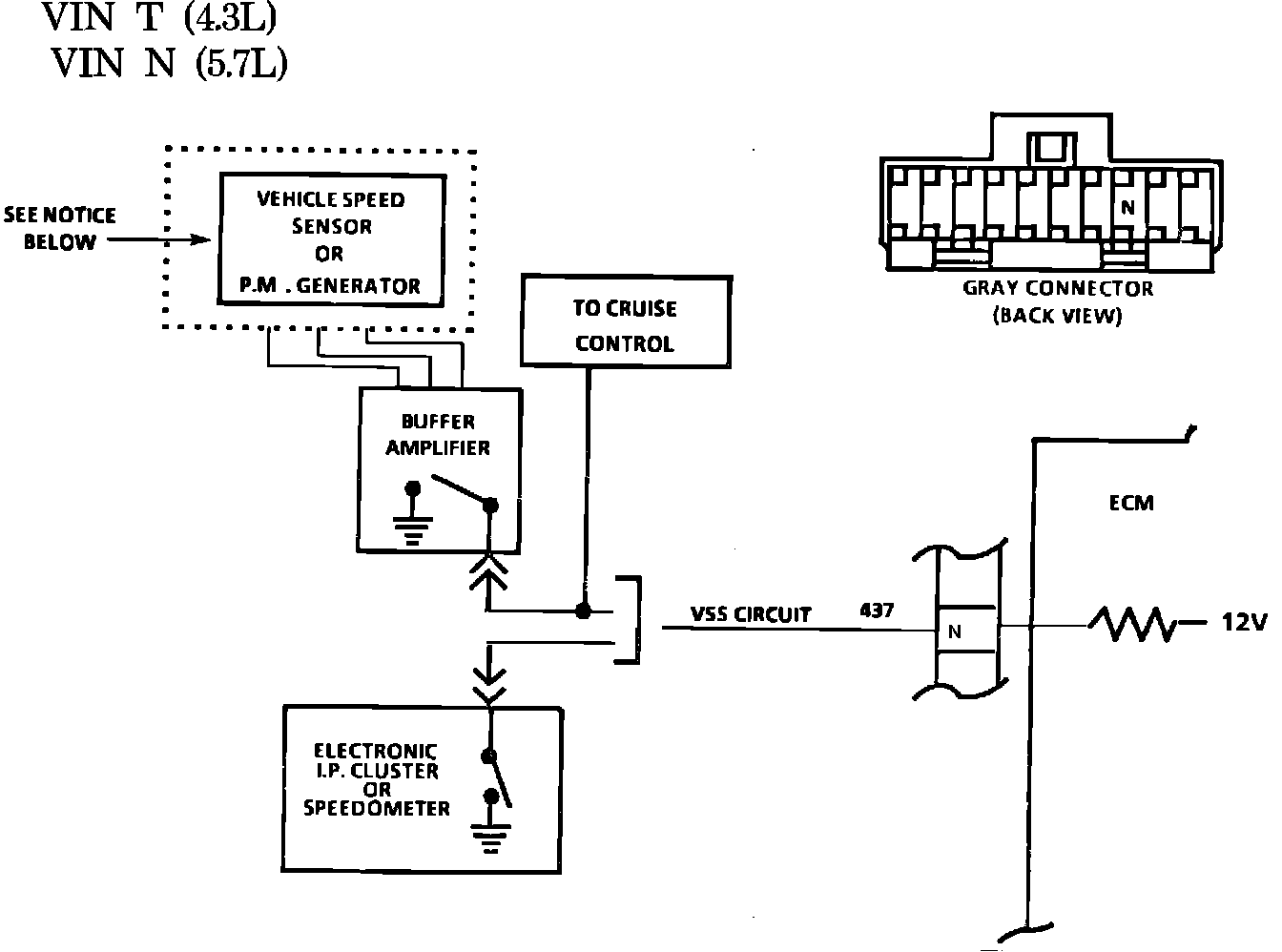 The ECM applies and monitors 12 volts on CKT 437. CKT 437 connects to the Vehicle Speed Sensor which alternately grounds CKT 437 when drive wheels are turning. This pulsing action takes place about 2000 times per mile and the ECM will calculate vehicle speed based on the time between "pulses".