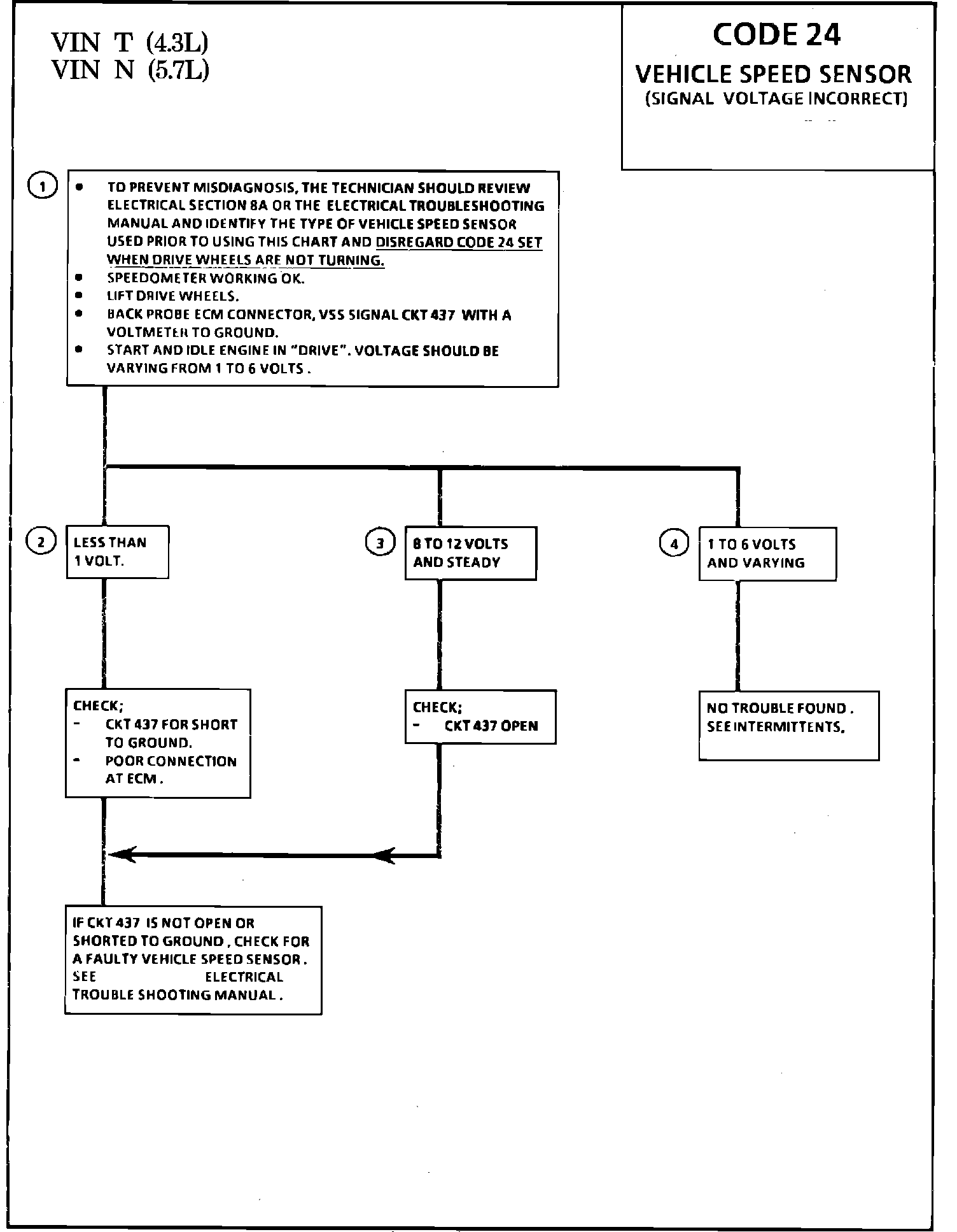 To prevent misdiagnosis, the technician should review the Electrical Troubleshooting Manual and identify the type of Vehicle Speed Sensor used prior to using this chart. Disregard a Code 24 set when drive wheels are not turning.