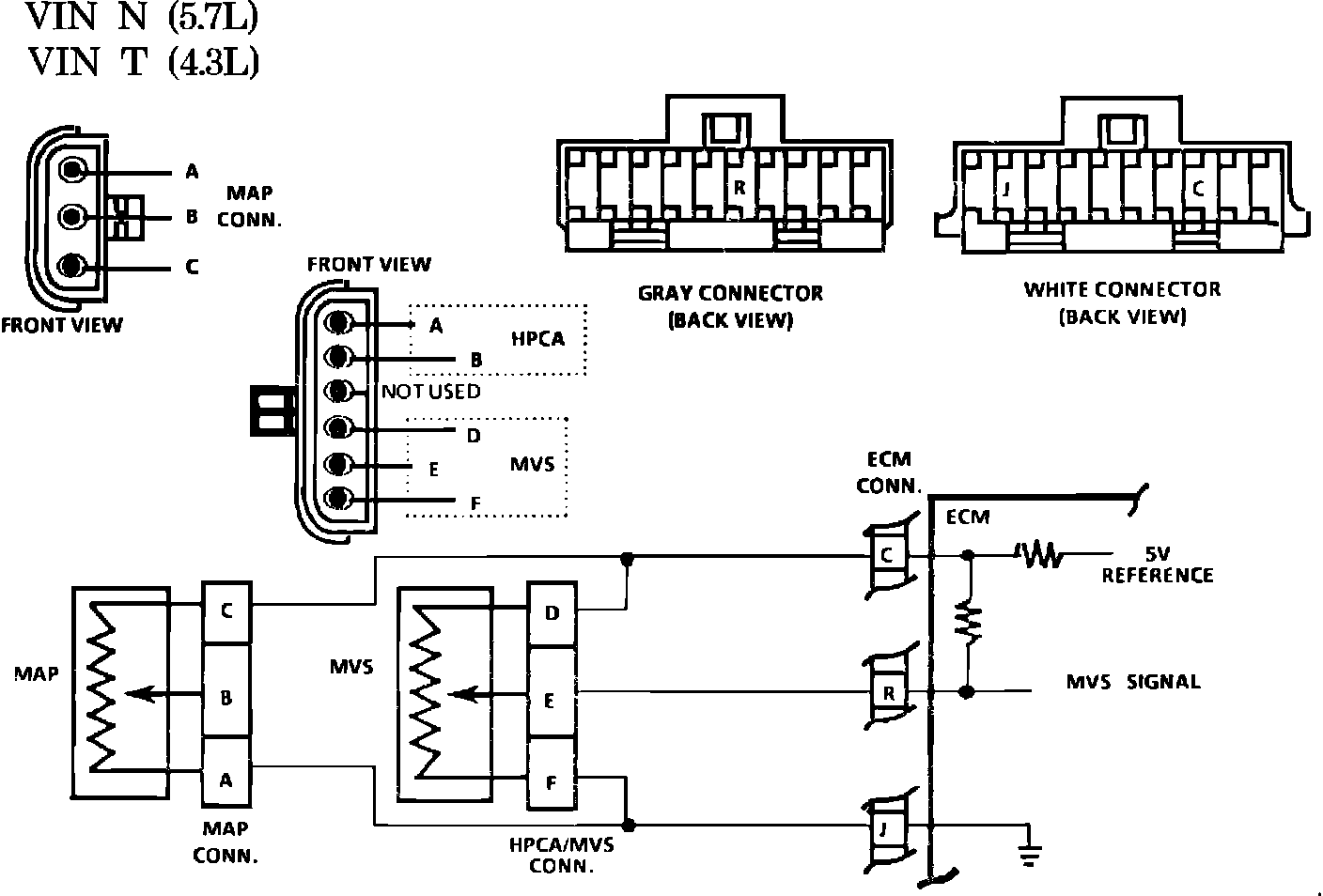 The ECM regulates ignition supplied voltage from ECM terminal "A" down to 5 volts, which it supplies to the MAP sensor and Metering Valve Sensor (MVS) through ECM terminal "C". To aid in fault detection and diagnosis, a pull-up resistor is connected between "5V ref." terminal "C" and "MVS" terminal "R" inside the ECM. If the "MVS circuit from ECM terminal "R" is open, the voltage reading at terminal "R" will be about 5 volts.