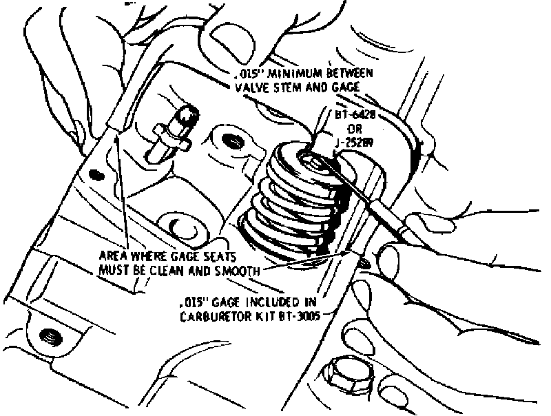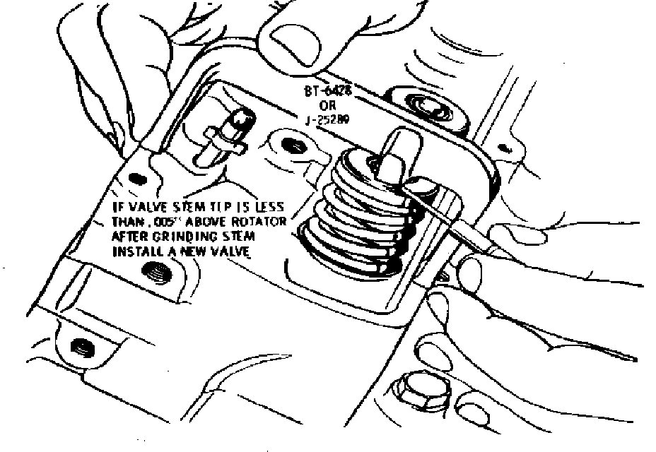 Whenever a new valve is installed or after grinding valves, it is necessary to measure the valve stem height with the special tool as shown in Fig. 20. There should be at least .015 inch clearance between the gauge and end of valve stem. If clearance is less than .015 inch, remove valve and grind end of valve stem as required. Check valve rotator height, Fig. 21. If valve stem end is less than .005 inch above rotator, the valve is too short and a new valve must be installed.