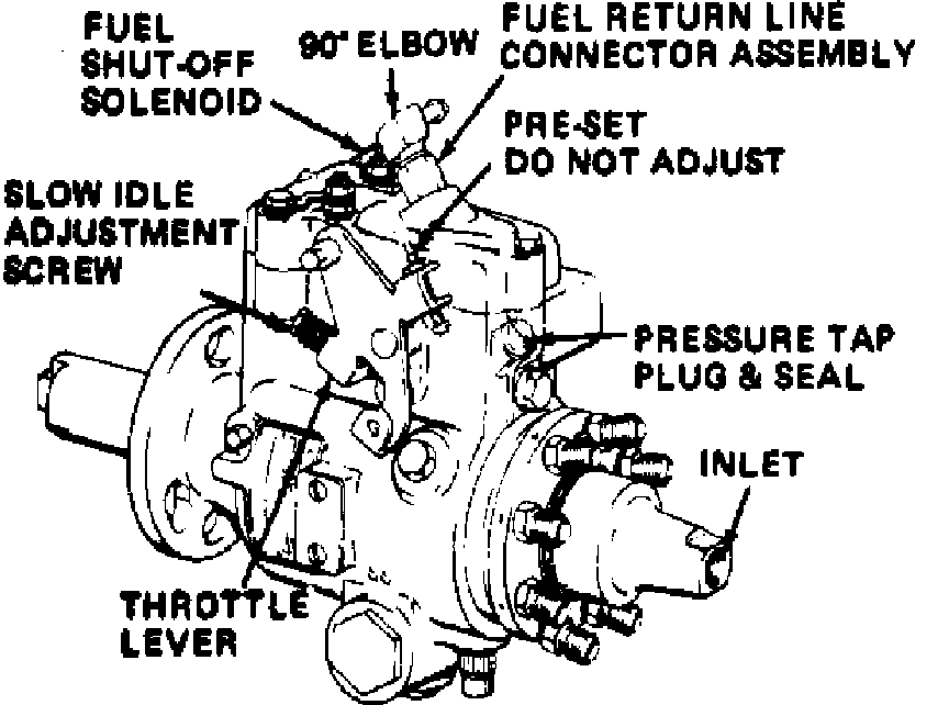 a. Remove electrical connector from housing pressure cold advance terminal, Figs. 43 and 44. If pressure remains at 0, remove injection pump cover and check operation of advance solenoid. If it is binding, repair or replace parts as necessary.