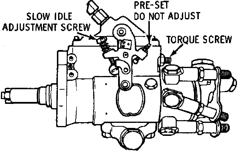 2. On Roosa-Master pumps, remove pressure tap plug. On CAV pumps, remove torque screw, Figs. 41 and 42. If equipped with torque screw, to avoid disturbing adjustment add a second nut to lock nut, then back out screw with nuts attached.