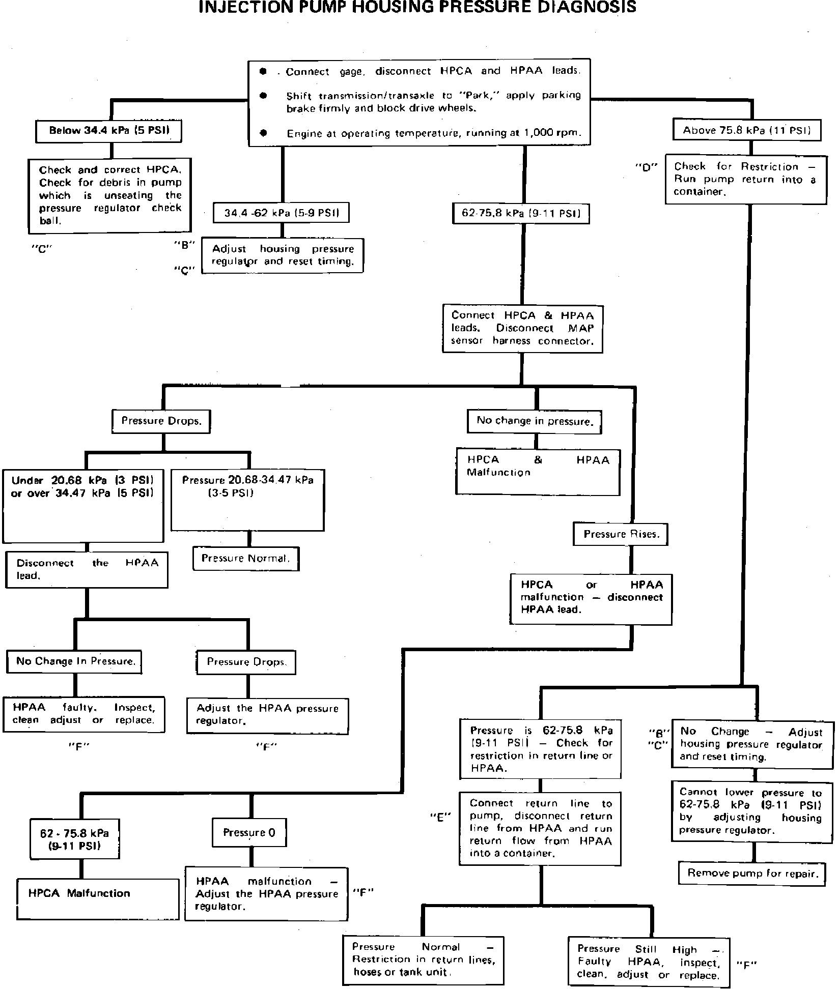 Refer to diagnostic chart, Fig. 46, to check housing fuel pressure. The following procedures are to be used in conjunction with letter references contained in the diagnostic chart.