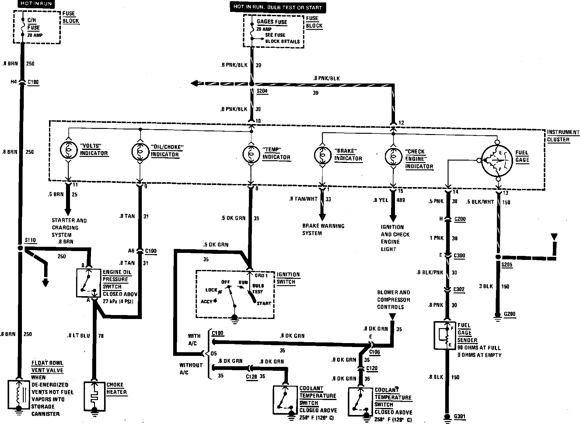 Fig. 37 Warning Indicators, Choke Heater & Float Bowl Vent Valve Wiring Circuit. 1985 Chevette & T1000: