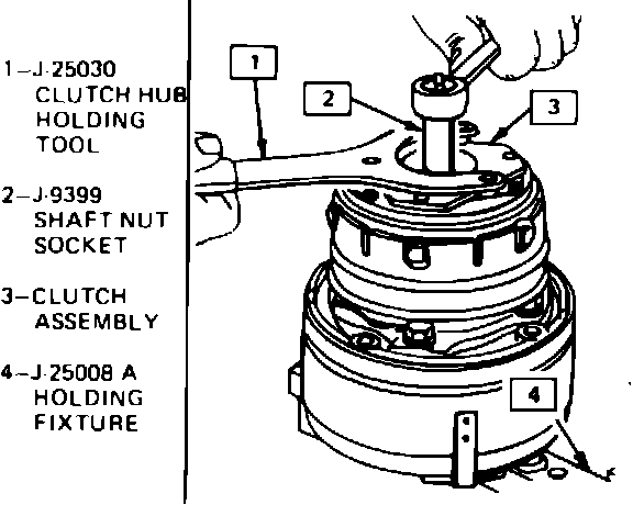 1. With compressor secured to a suitable holding fixture and clamped in a vise, remove shaft nut using tools J-25030 and J-9399.