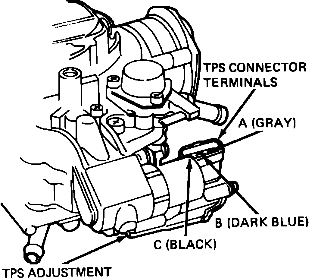 2. Connect digital voltmeter between terminals B and C of TPS, leaving harness connector in place, Fig. 12. Insert voltmeter probes into rear of connector, ensuring that probes make proper contact with connector terminals.