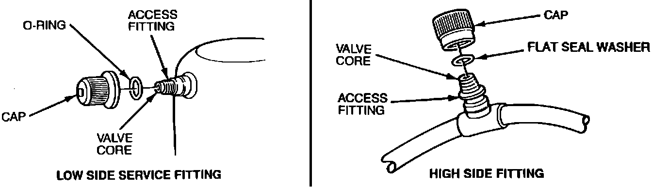 When servicing any vehicle's A/C system, make sure all access fitting cap seals (refer to Figure) are in place and tight. Caps should be threaded on until contact with the "O" ring seal is made and then tightened another 1/4 - 1/2 turn to ensure proper sealing.