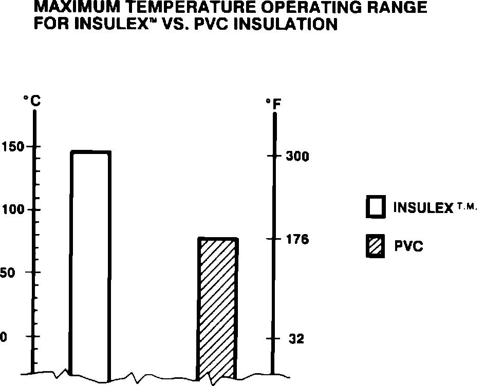 For wiring repairs in areas where temperatures exceed 80 degrees C (176 degrees F), a cable of sufficient size with a special thermo set compound is required. Cross link polythylene (Insulex (TM)) is such a material and should be used where temperatures exceed 80 degrees C (176 degrees F) such as the engine compartment, especially when the wiring harness is near the exhaust manifold or exhaust system. Cross link polythylene can withstand continuous operating temperatures of up to 148 degrees C (300 degrees F), see Fig. 1, and has 25% more resistance to abrasion and 10% more "pinch" protection than general purpose PVC cable insulation. Should a short occur, the cross link polythylene insulation will not burn.