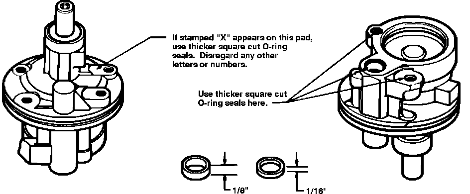 There has been a design change in the hydraulic pump housing. Look at the mounting pad shown. If the mounting pad shows a stamped "X" use the three thicker square cut O-ring seals provided in this kit.