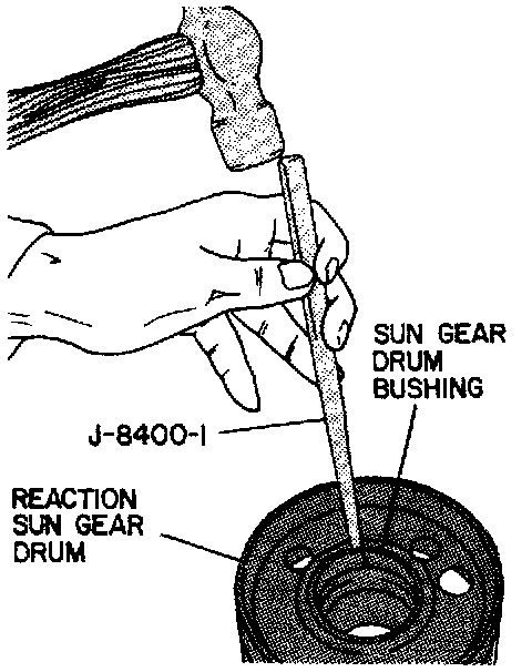 2. Inspect bushing for wear. If bushing replacement is needed, remove bushing at bushing joint using a chisel, see first image. Install new bushing until flush with rear face of sun gear drum hub using tool J-23130-2 and handle J-8092, see second image.