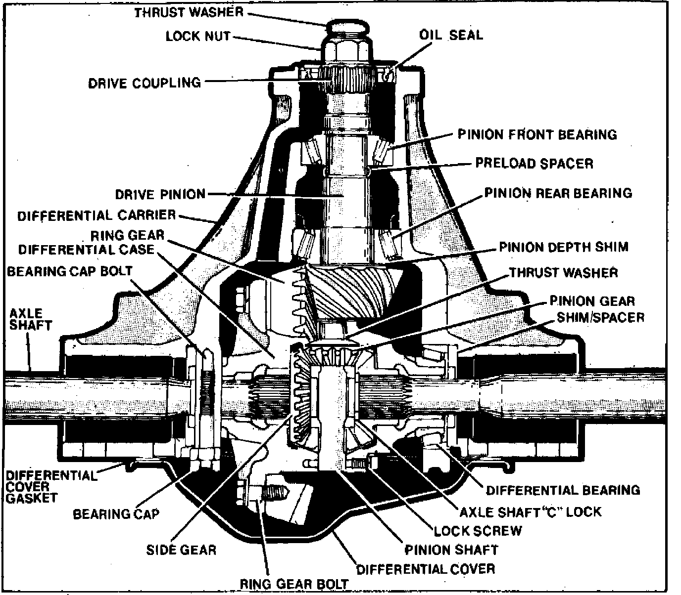 The overhung hypoid drive pinion, is supported by two pre-loaded tapered roller bearings. The pinion shaft is sealed by means of a molded, spring loaded, rubber seal. The seal is mounted on the pinion shaft flange which is splined and bolts to the hypoid pinion shaft.