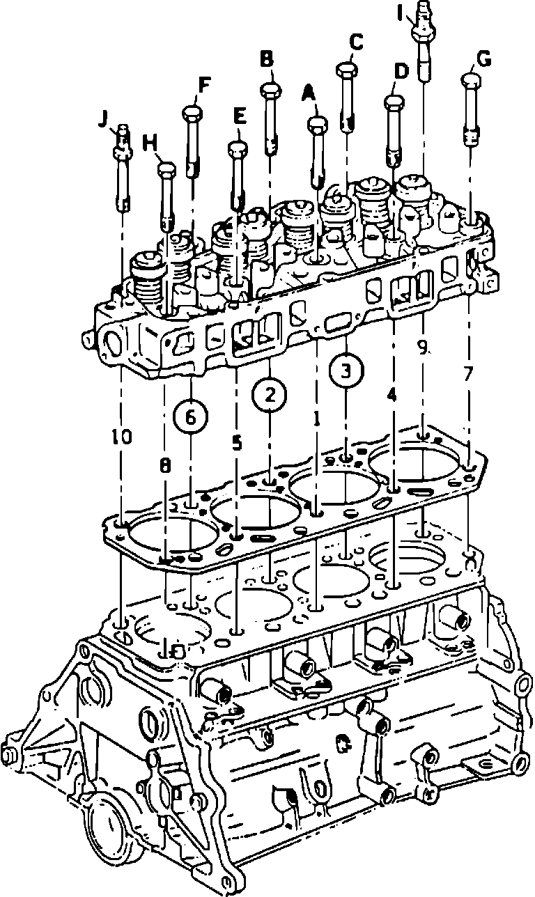 The head bolts most susceptible to this condition are the center three located closest to the exhaust manifold, i.e. bolts # 2, # 3, and # 6, see FIGURE 1. If one of these three bolts is broken, replace all 3 bolts with new ones per the Application Table.