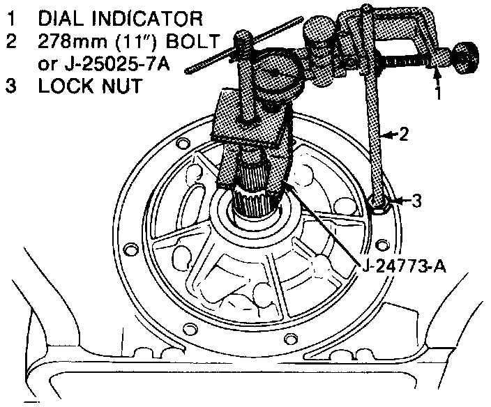 c. Install oil pump remover tool No. J-24773-A and suitable dial indicator.