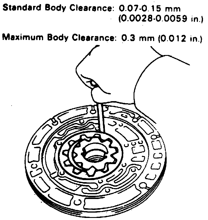 2. Using a suitable feeler gauge, measure distance between gear teeth and crescent shaped part of pump body for both gears. If clearance exceeds .012 inch, replace drive gear, driven gear or pump body as necessary, Fig. 8.