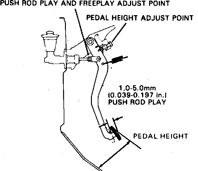 4. Push in on clutch pedal until resistance is felt, then check pushrod and pedal freeplay. Pushrod play should be .039---.197 inch, while freeplay should be .51---.91 inch for 1985 vehicles, or .20---.59 inch for 1986---88 vehicles.