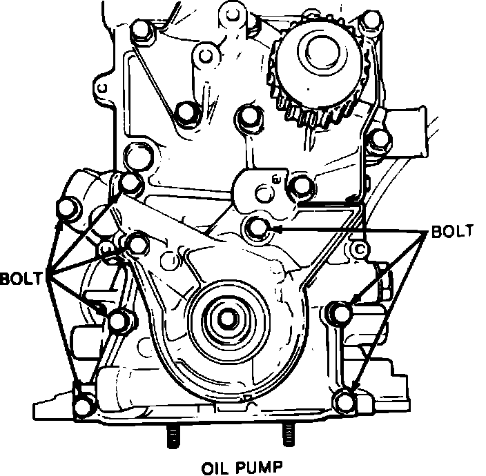10. Reverse procedure to install. Apply suitable sealant to oil pump mating surface, Fig. 15.
