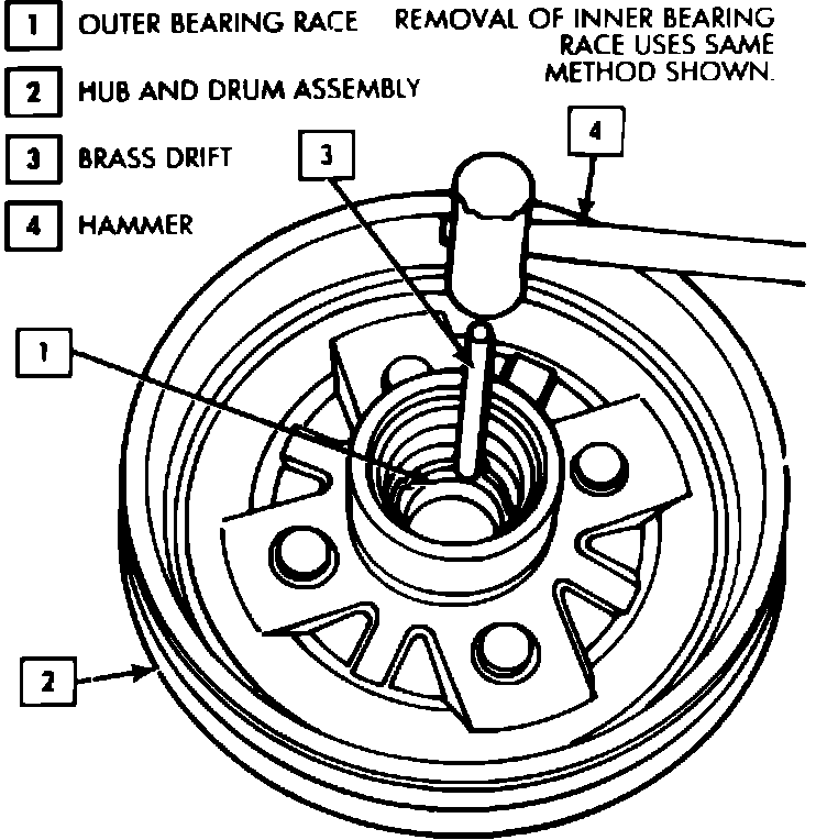 7. Tap inner bearing outer race and outer bearing outer race out of hub, Fig. 7.