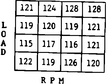 Although the integrator can correct the fuel delivery over a wide range, it is only for a temporary correction. Therefore, another control called "block learn" was added. Although it cannot make as much correction as the integrator, it does so for a longer period of time. It gets its name from the fact that the operating range of the engine for any given combination of rpm and load is divided into 16 cells or blocks (See Figure 1). When the engine is operating at any given combination of rpm and load, the system would be operating in one of these blocks. The computer has a given fuel delivery stored in each block. As the operating range gets into a given block, the fuel delivery will be based on what value is stored in memory in that block. Again, like the integrator, the number represents the "ON" time of the injector; therefore, the higher the number the more fuel would be delivered. Also, just like the integrator, the number 128 represents no correction to the value that is stored in that cell or block. When the integrator increases or decreases, block learn, which is also watching the integrator, will make a correction which will be reduced until finally the integrator will return to 128 if the block learn has corrected the fuel delivery.