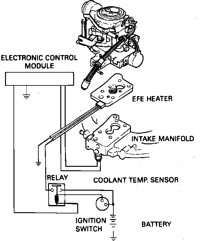 The EFE system, Fig. 1, is comprised of the EFE heater, electronic control module, coolant temperature sensor and the EFE relay assembly.