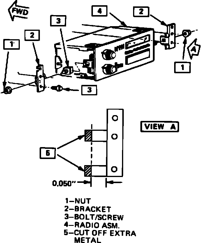 Remove the right hand radio bracket and remove enough material from the tab such that only .050 inch (1.6 mm) material remains on the tab (see illustration.)