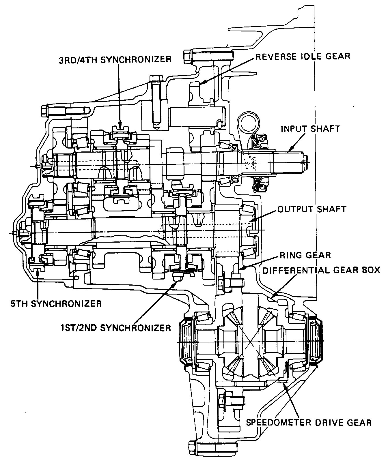The five-speed transaxle assembly is a constant-mesh design transmission, combined with a differential unit and assembled in a case with a rear cover. All forward gears are in constant mesh. For ease of shifting and selection of the desired gear range, synchronizers with blocker rings, controlled by shift forks are used. Reverse uses a sliding idler gear arrangement.