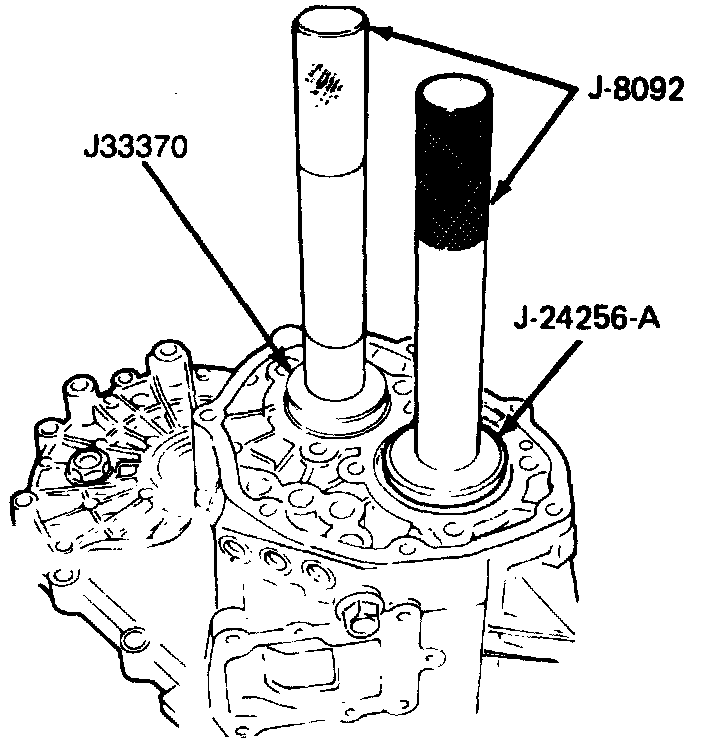 12. Remove rear bearing outer race using tool No. J-24256-A from case. Use tool No. J-33370 to remove output shaft race. Tool No. J-8092 can be used as a common driver for both applications.