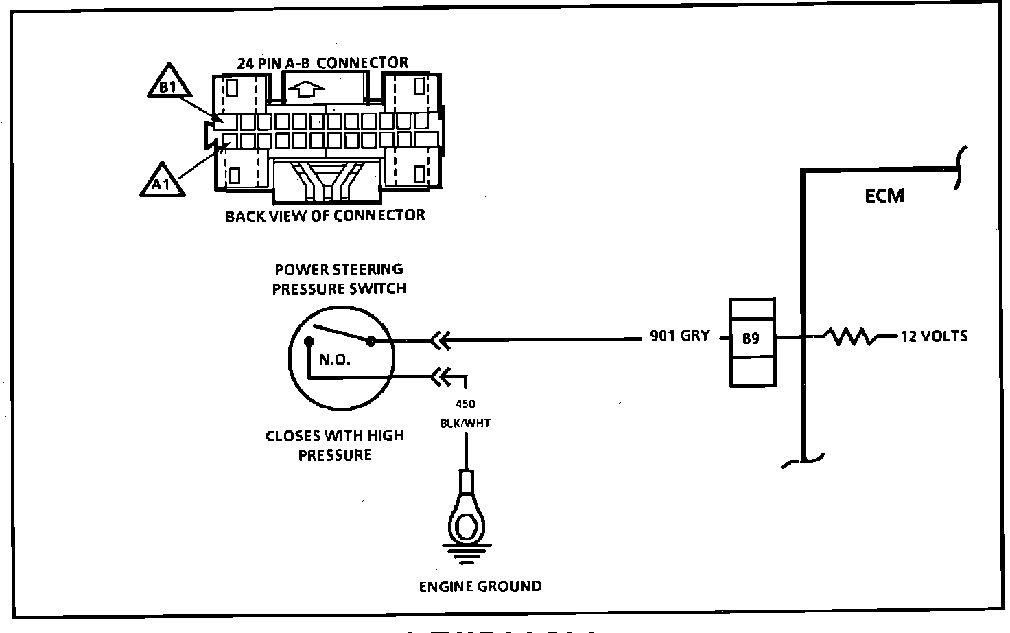 ^ A pressure switch that will not close, or an open CKT 901 or 450, may cause the engine to stop when power steering loads are high.