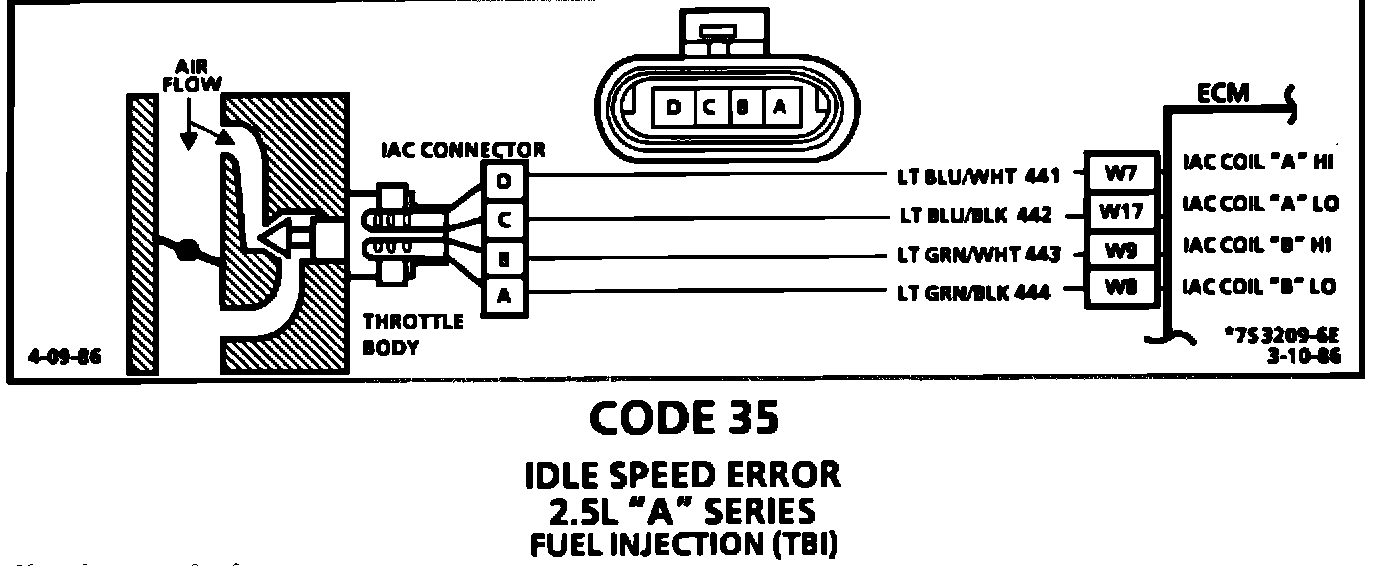 Code 35 will set, when the closed throttle engine speed is 100 rpm above or below the desired idle speed for 45 seconds. Review general description in Section "C".