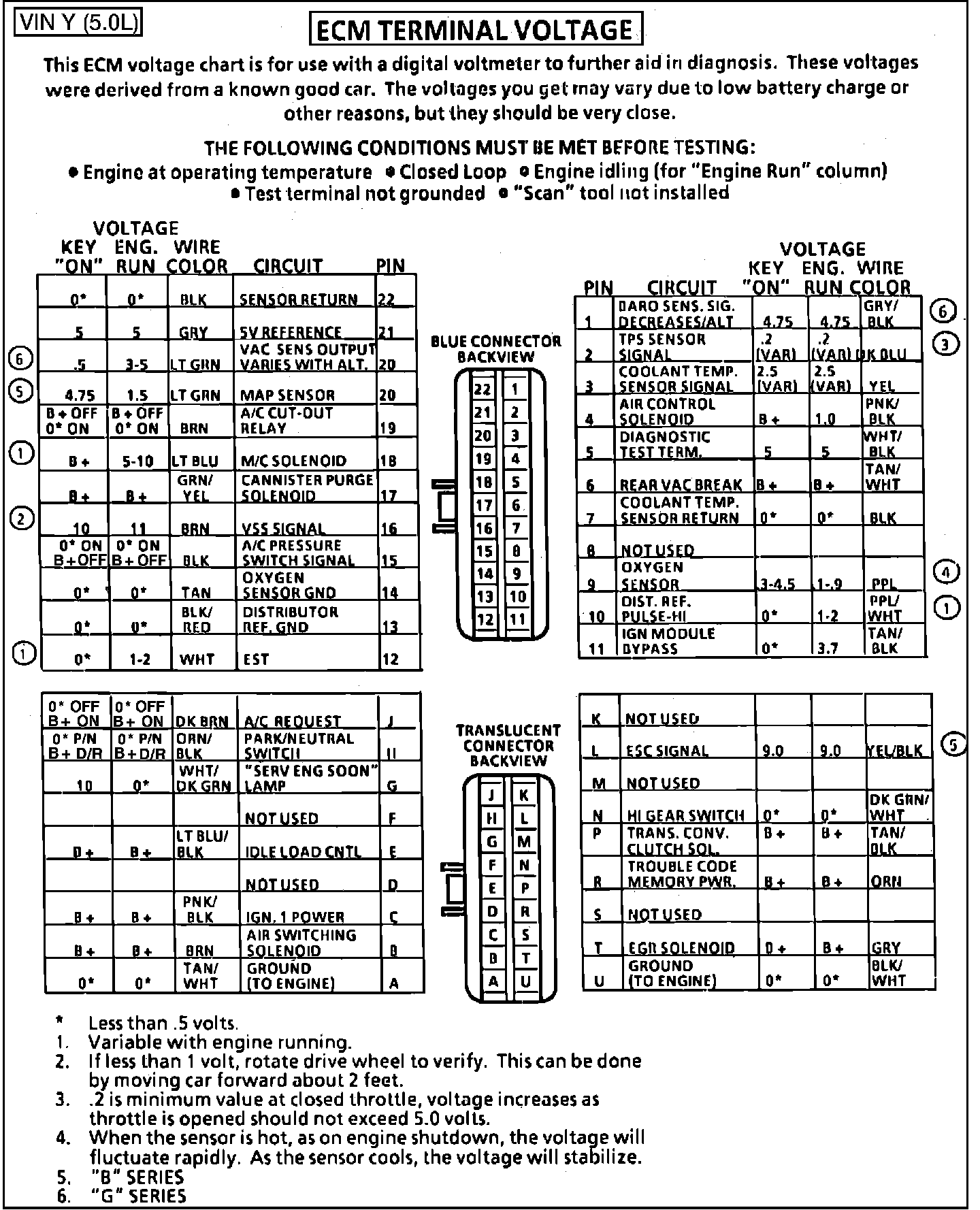 Fig. 051 - ECM Connector Terminal Identification & Voltage Specifications.: