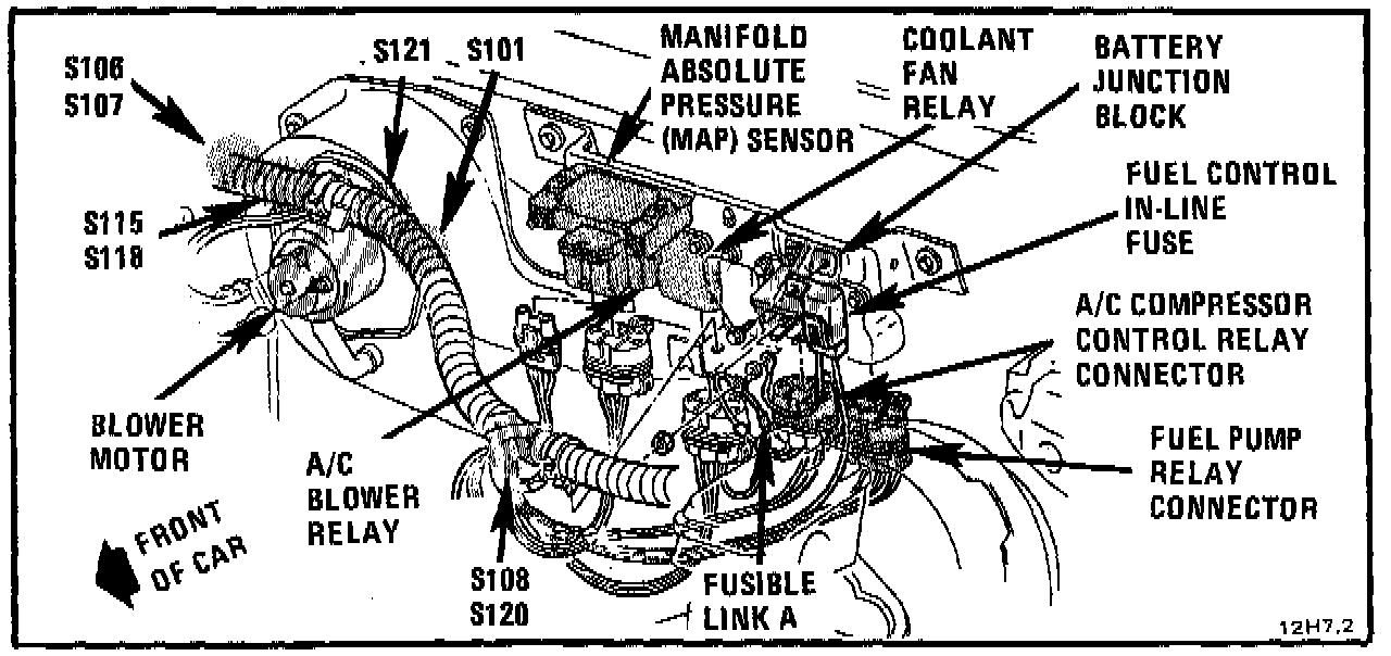 The A/C Compressor Control Relay is located at the center front of the dash on the relay bracket.