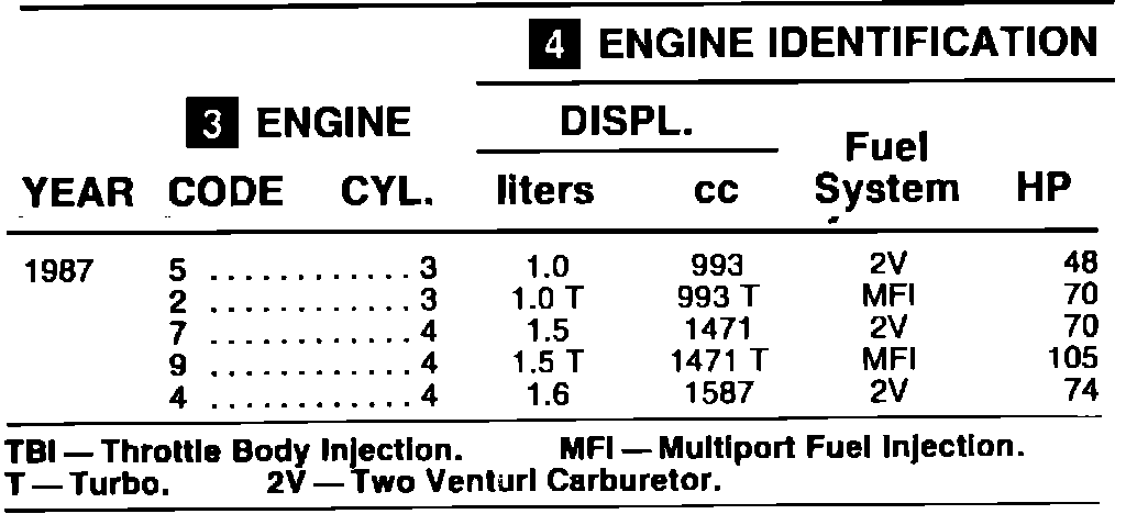 ENGINE IDENTIFICATION: On the line where the engine code appears, read to the right to identify the engine.