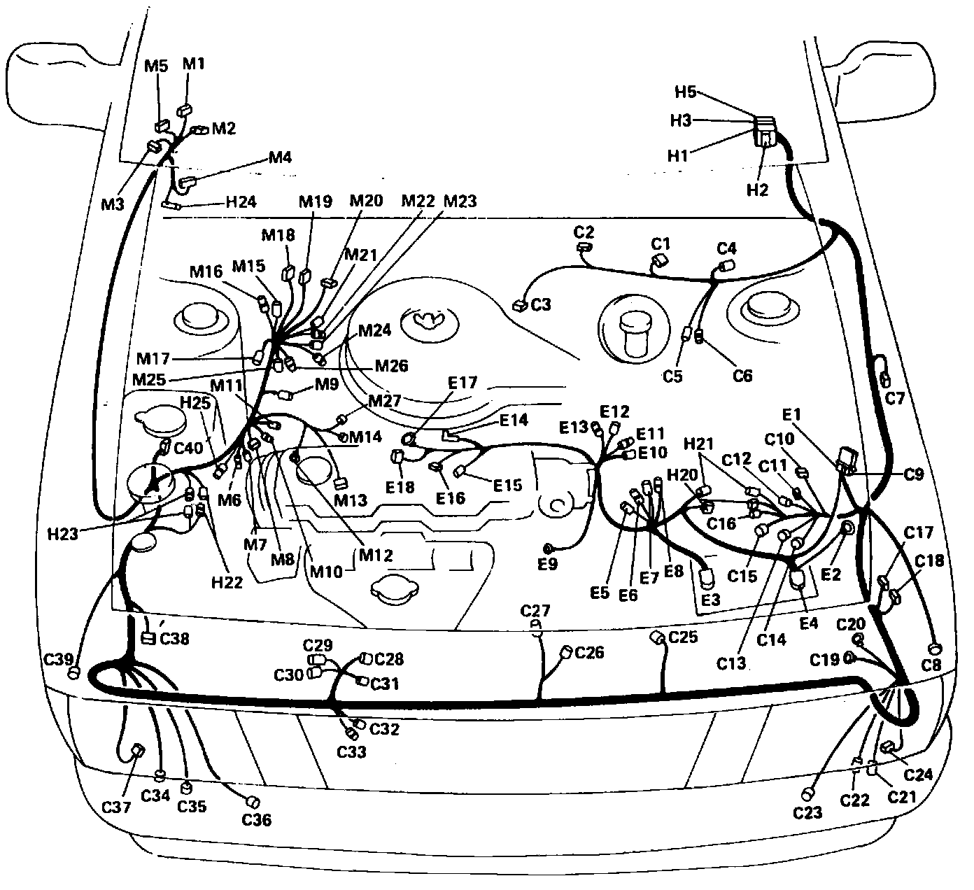M1 to M5: LH rear of Engine Compartment, near Firewall