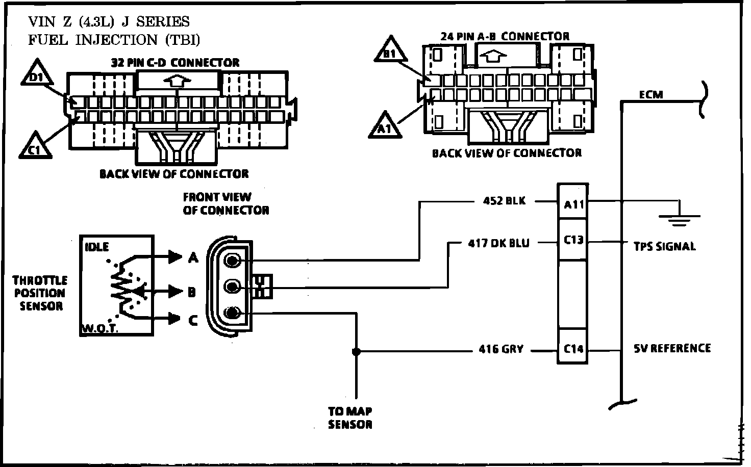 Circuit Description: The Throttle Position Sensor (TPS) provides a voltage signal that changes relative to the throttle valve. Signal voltage will vary from less than 1.25 volts at idle to about 5 volts at wide open throttle (WOT).