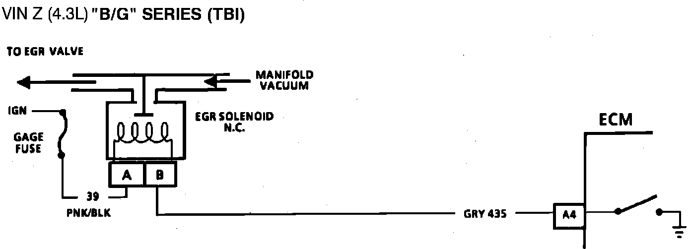 The ECM operates a solenoid to control the exhaust gas recirculation (EGR) valve. This solenoid is normally closed. By providing a ground path, the ECM energizes the solenoid which then allows vacuum to pass to the EGR valve.