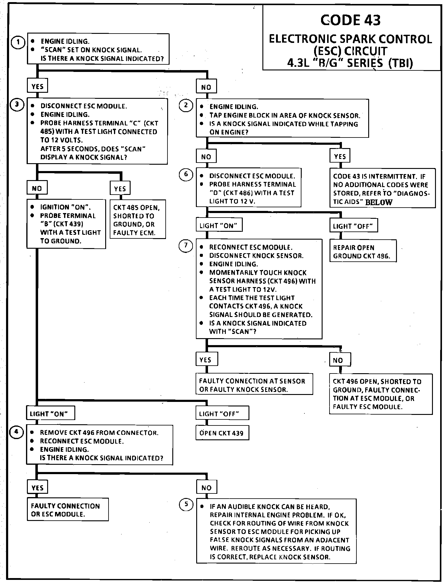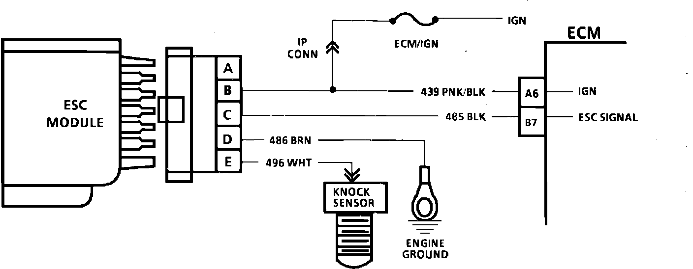 DIAGNOSTIC AIDS Code 43 can be caused by a faulty connection at the knock sensor, at the ESC module or at the ECM. Also check CKT 485 for an open or short to ground.