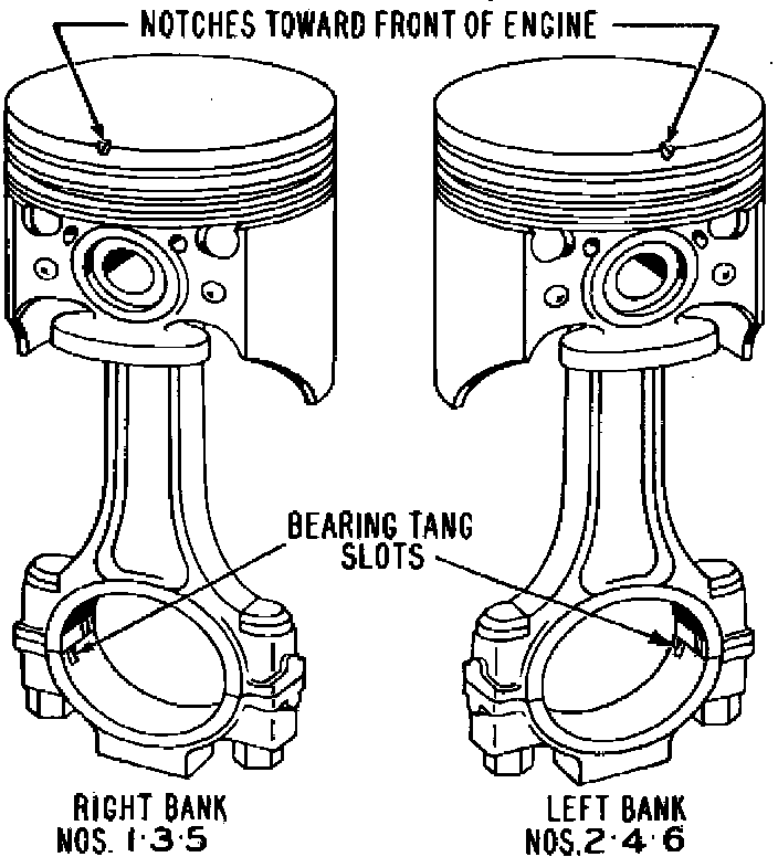 Assemble pistons to connecting rods as shown in Figs. 19 through 22. Upon installation, measure the connecting rod side clearance using a suitable feeler gauge. Refer to ``Engine Rebuilding Specifications'' for connecting rod side clearance.