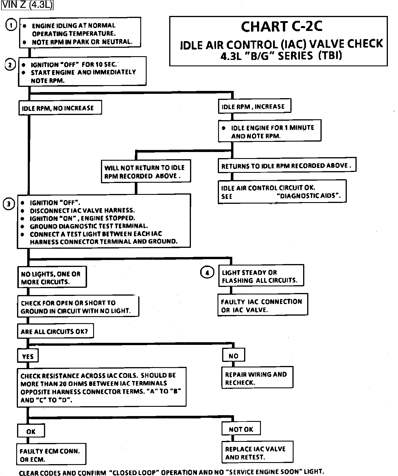 1. Continue with the test, even if engine will not idle. If idle is to low, "Scan" will display 80 or more counts, or steps. If idle is high, it will display "O" counts. Occasionally, an erratic or unstable idle may occur. Engine speed may vary 200 rpm, or more, up and down. Disconnect IAC. If the condition is unchanged, the IAC is not at fault.