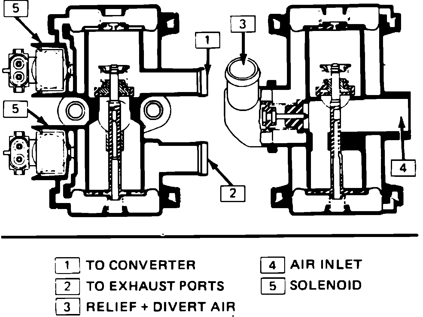 When engine is cold (``Open Loop''), the port solenoid is energized and air pump pressure opens the passage to the exhaust ports. During normal operation (``Closed Loop''), the port solenoid is de-energized, the converter solenoid is energized, and air pump pressure opens the passage to the catalytic converter. When the ECM determines that air divert is necessary, both solenoids are de-energized and air pump output is diverted to the air cleaner through a divert/relief valve. The divert/relief valve limits system pressure.
