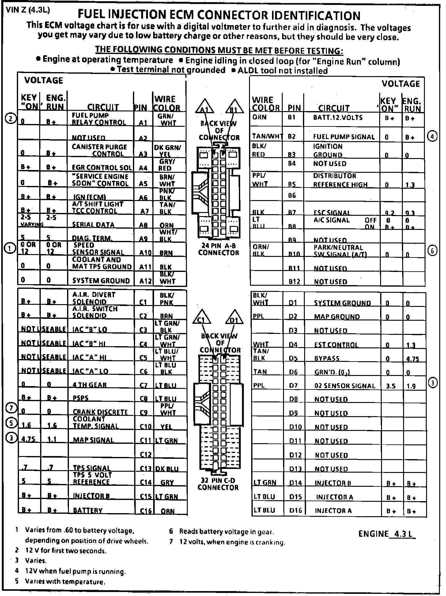 Fig. 021 ECM Connector Terminal I.D. & Volt. Specifications: